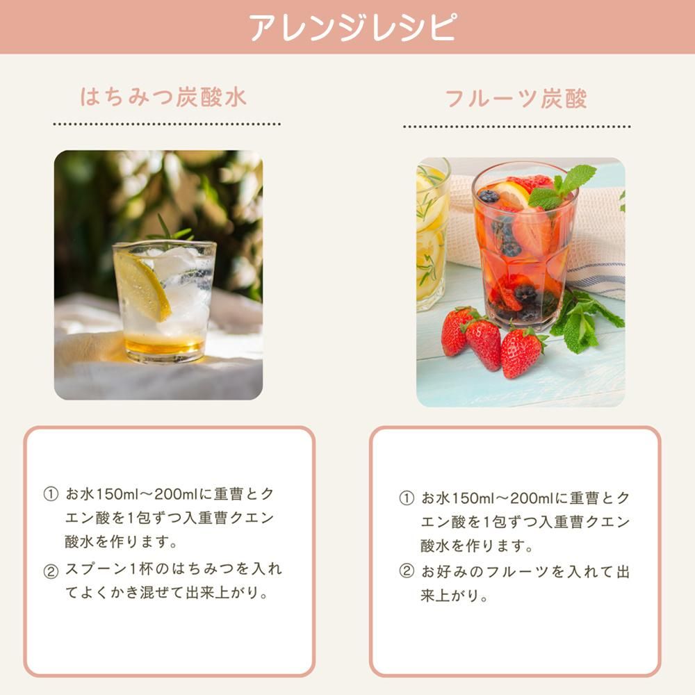 お水150ml〜200mlに重曹とクエン酸を1包ずつ入れてお召し上がりください。冷たいお水でさらに美味しくお召し上がりいただけます。